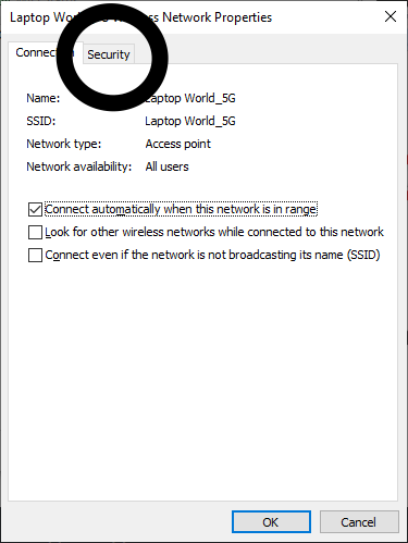 Within the Wireless Properties, head to the ‘Security’ tab, where vital information about the network is stored.