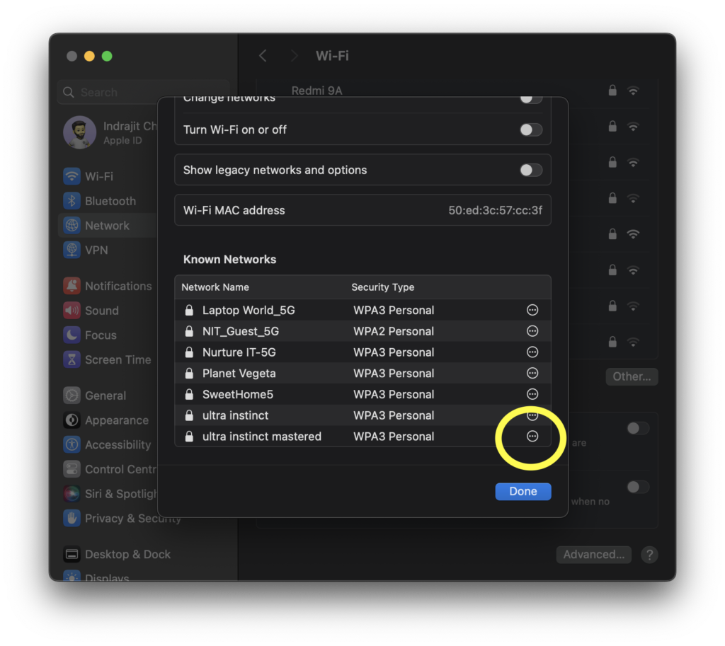 In the ‘Known Networks‘ section, locate the network you’re connected to and Click on the three dots.