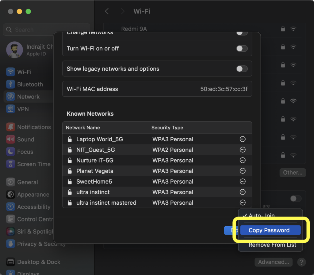From there, select ‘Copy Password’ and the password will be copied to your clipboard. You may open a notepad and paste it or directly paste it in a whatsapp Window to share it.