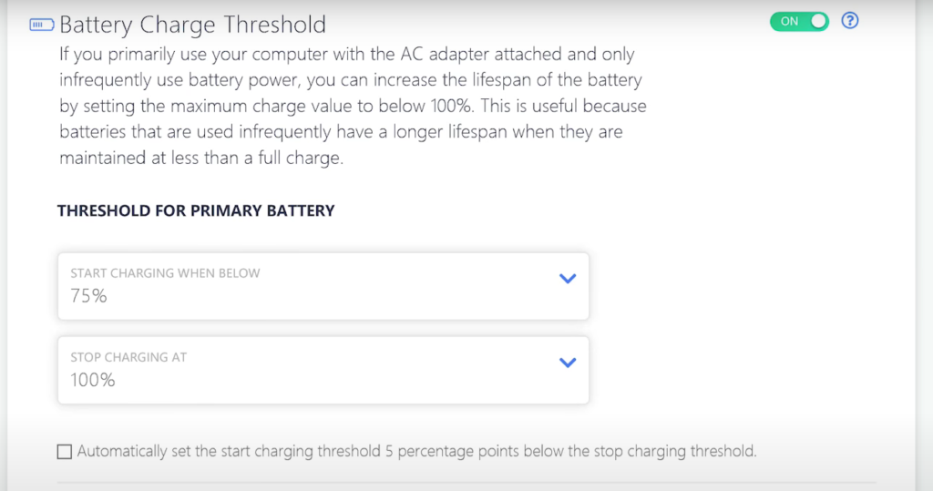 5. Flip the switch for Battery Charge Threshold to enable the battery charge limiter.