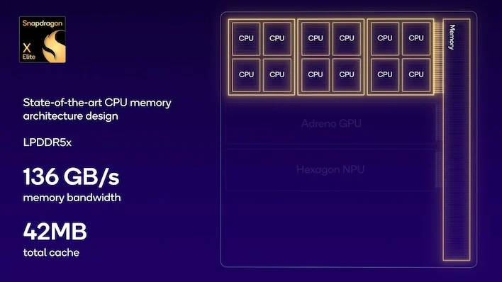 The X Elite boasts support for LPDDR5x, an advanced CPU memory architecture that delivers an impressive memory bandwidth of up to 136GB/s. In comparison, the DDR5 memory in the latest Windows laptops offers only up to 64GB/s of bandwidth.