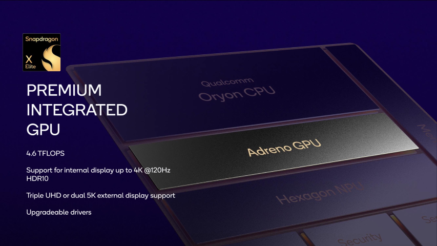 The X Elite includes the Adreno GPU found in almost every flagship gaming phone on the market. It supports up to 4K 120Hz display and three UHD or two 5K external displays.